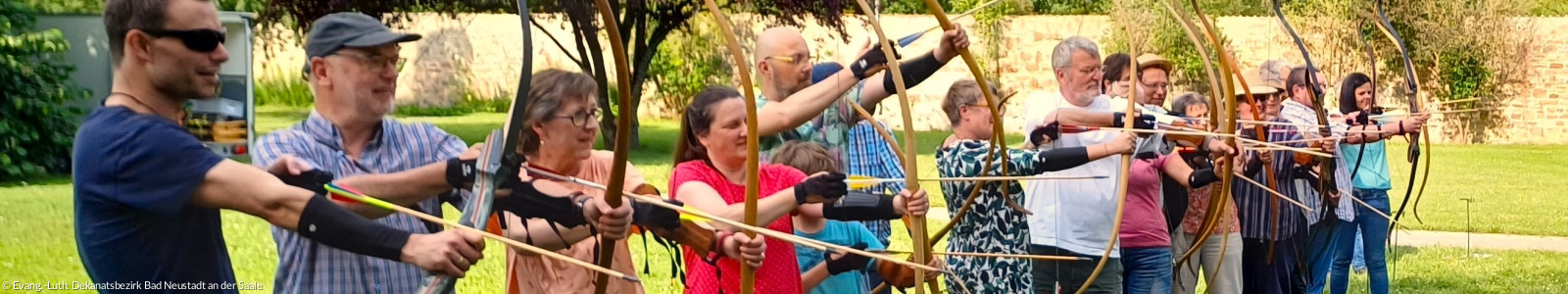 Normalerweise ist das monatliche Treffen der Hauptamtlichen im Dekanatsbezirk eine „trockene“ Sitzung mit zahlreichen Tagesordnungspunkten und findet im Gemeindehaus in Bad Neustadt statt. Im Juli aber, quasi als Betriebsausflug, geht es traditionell woanders hin. Im vergangenen Jahr war das die Arbeits-Klausur mit Übernachtung auf dem Schwanberg und am zweiten Tag gemütlichem Ausklang in einer Weinwirtschaft. Heuer ging es zwar nicht so aufwendig nur nachmittags nach Maria Bildhausen, dafür konnten die verschiedenen Berufsgruppen (Pfarrerinnen und Pfarrer, Diakoninnen und Religionspädagoge sowie einige Angehörige) jedoch gemeinsam eine besondere Erfahrung machen. Unter Anleitung von Jürgen Fries, Diplom – Psychologe und Coach für „Intuitives Bogenschießen“, betrat man sportliches Neuland.